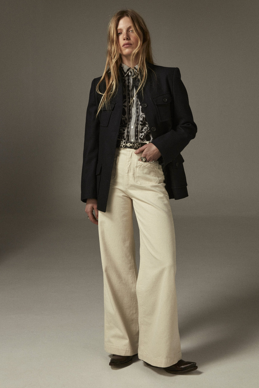 - Bomber Diega color cioccolato fantasia maxi pied de poule ecrù e cioccolato. Colletto con fondo a contrasto, apertura con fila di bottoni a scomparsa, spalla scesa, polsini con bottone, modello leggermente stondato corto, foderato, tasche taglio verticale.