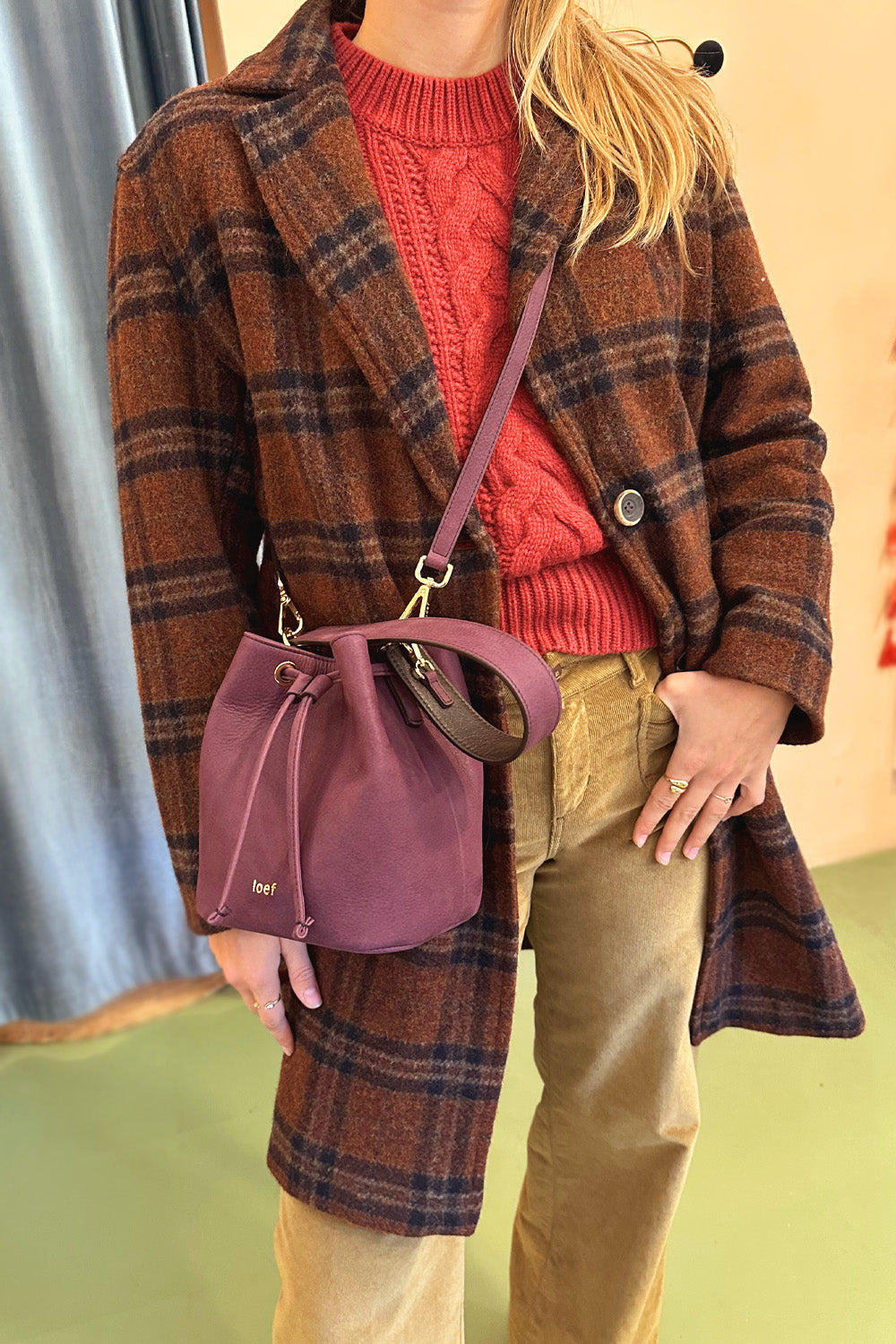 - Cappotto Diega color terracotta, modello dritto morbido fantasia principe di galles ecrù e blu. Scollo a V, chiusura con doippio bottone monofila, tasche con patella orizzontali. Foderato e destrutturato.