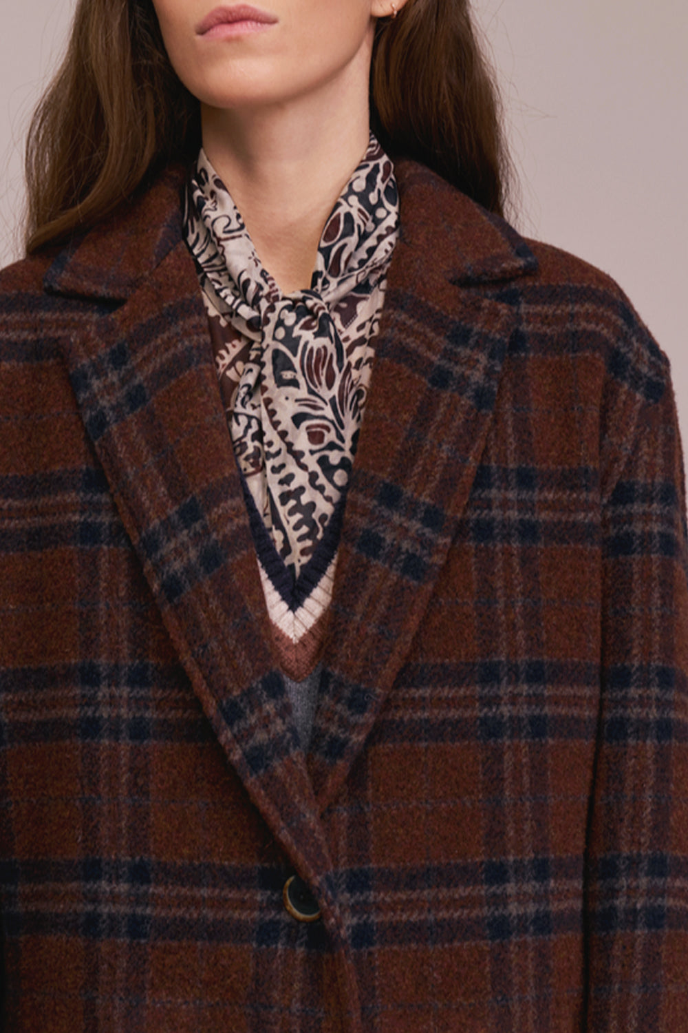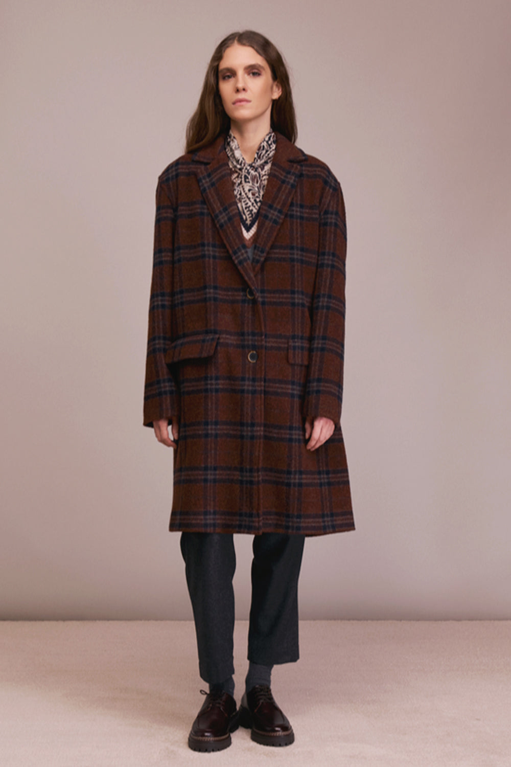 - Cappotto Diega color terracotta, modello dritto morbido fantasia principe di galles ecrù e blu. Scollo a V, chiusura con doippio bottone monofila, tasche con patella orizzontali. Foderato e destrutturato.
