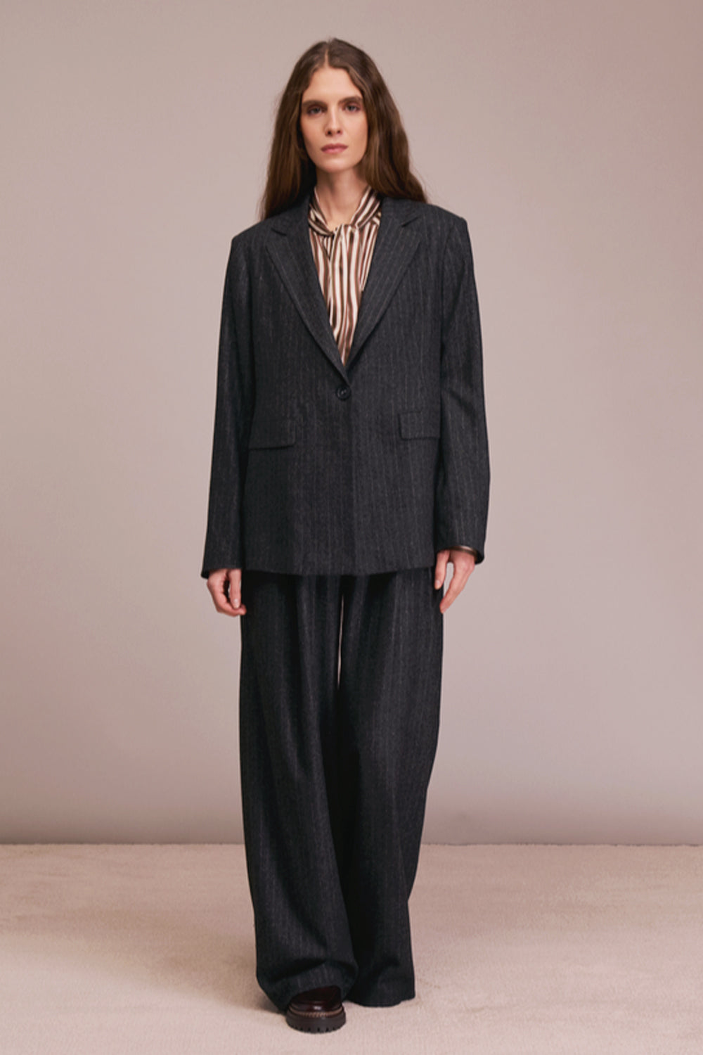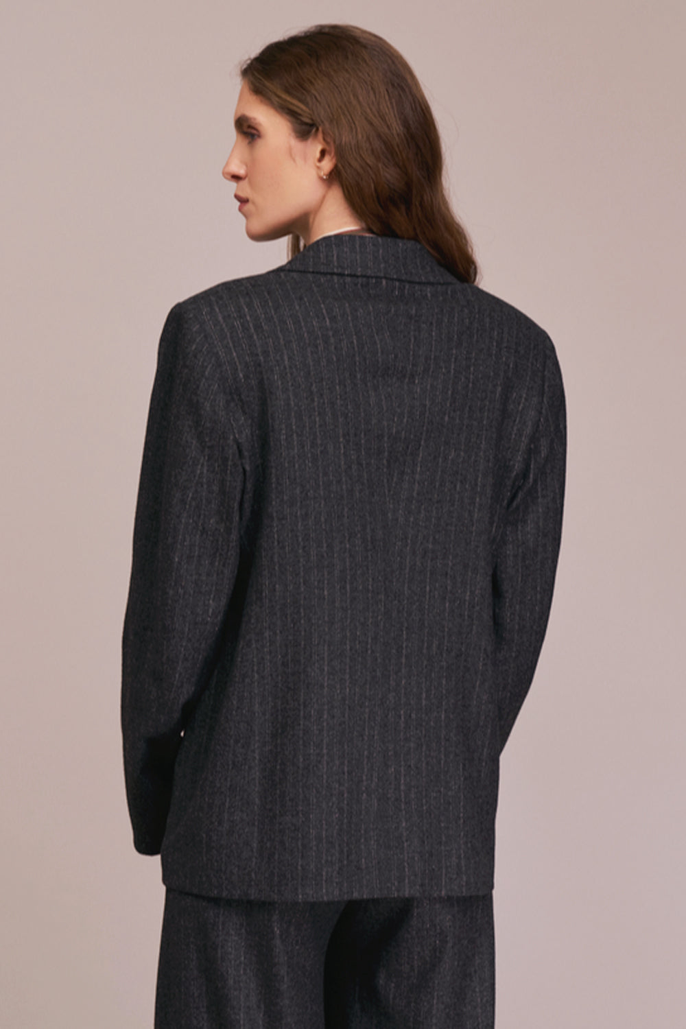 - Blazer Diega in lana grigio antracite malnge fantasia gessato lurex argento con riga puntinata. Modello dritto morbido, monopetto, due tasche orizzontali con patella, spalline molto morbide. Foderato.