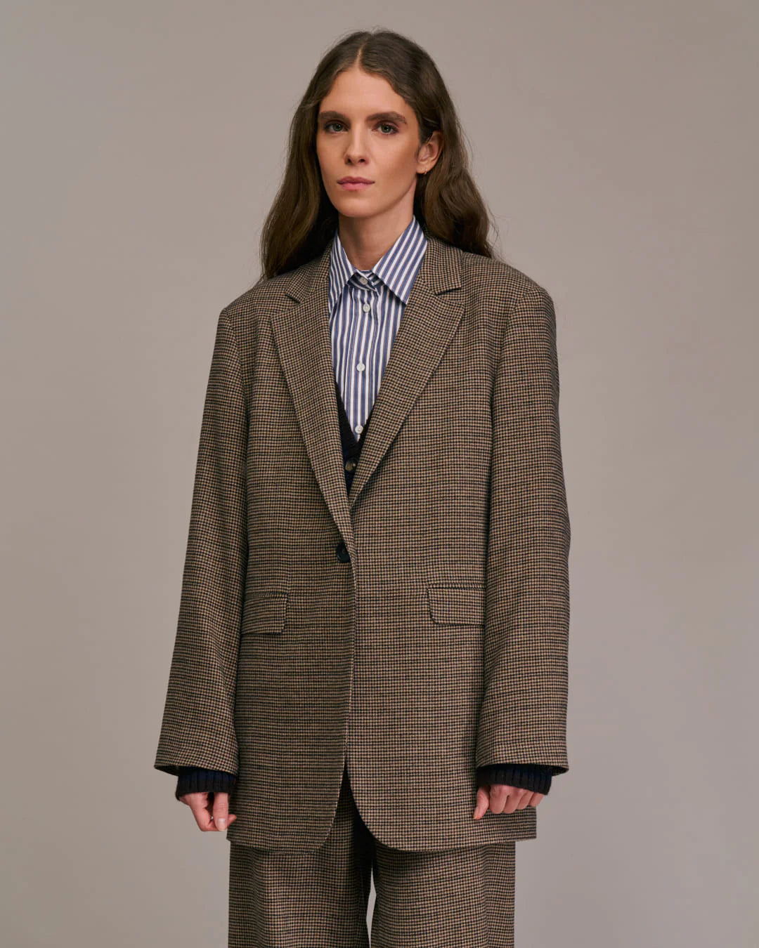 - Blazer Maison Hotel tessuto spigato color nocciola. Modello doppio petto su una fila, spacco sul retro, spalline, abbastanza corto, foderato, tasche orizzontali a filetto.