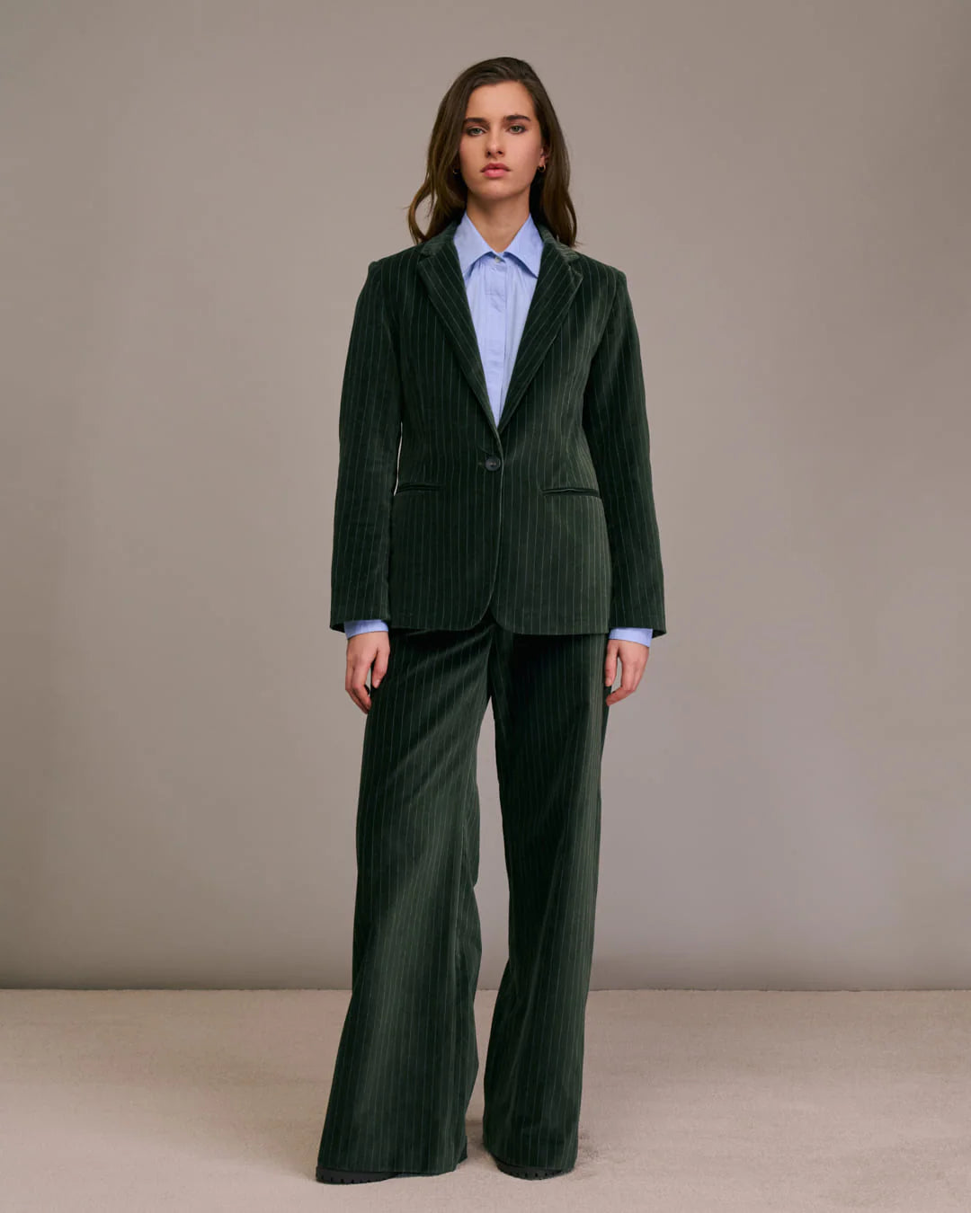 - Blazer Diega in velluto verde intenso fantasia gessata con riga puntinata leggermente azzurrata. Modello dritto, monopetto, tue tasche orizzontali a filetto, spalline. Foderato.