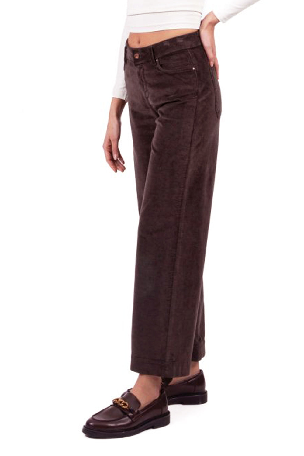 regolarePantaloni Cigalas modello L palace crop in velluto mille righe color cioccolato. Modello 5 tasche, vita regoalre, stretto su vita e glutei, gamba dritta media larghezza, tagliato alla caviglia. Chiusura con cerniera e bottone.