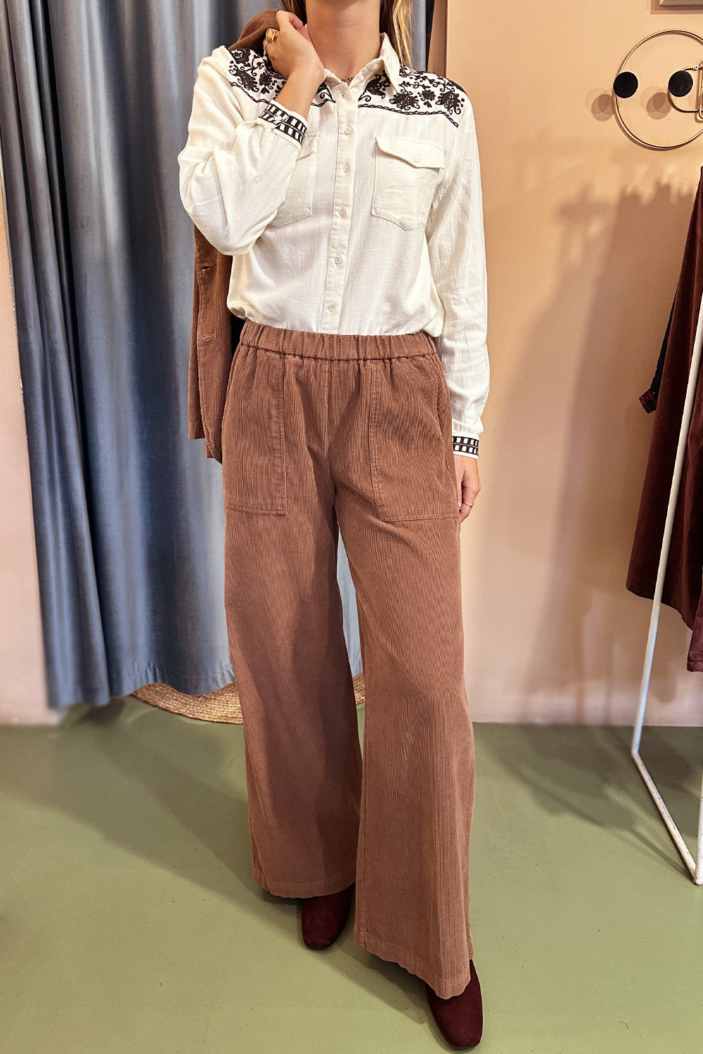 Pantaloni Maison Hotel in velluto mille righe color cioccolato. Modello vita alta, quattro tasche applicate, quelle davanti con treccina. Chiusura con bottone e cerniera a scomparsa, taglio stretto su vita e glutei e poi largo con gamba dritta.