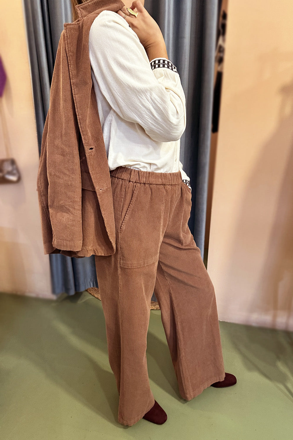 Pantaloni Diega in velluto millerighe color mocha mousse, tra il cognac e il rosa antico. Modello taglio dritto, elastico rivestito in vita, tasche davanti ampie applicate.