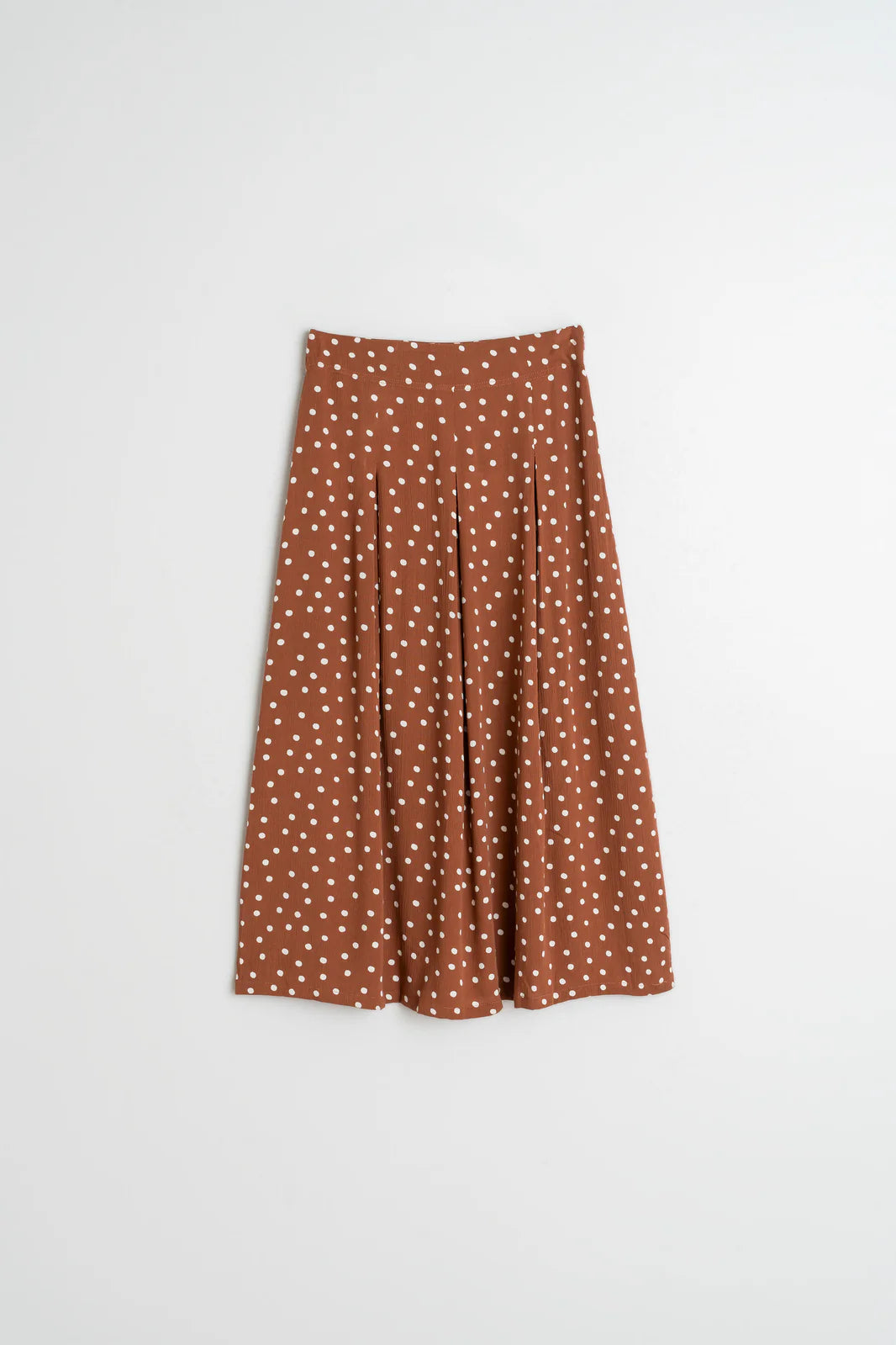Gonna Indi and Cold in viscosa color terracotta fanbtasia pois panna. Modello svasato con pieghe a vita bassa, vestibilità fasciante sulla vita e svasata sulla lunghezza. Chiusura con cerniera laterale. Dotata di sottogonna. Lunghezza circa a metà polpaccio.