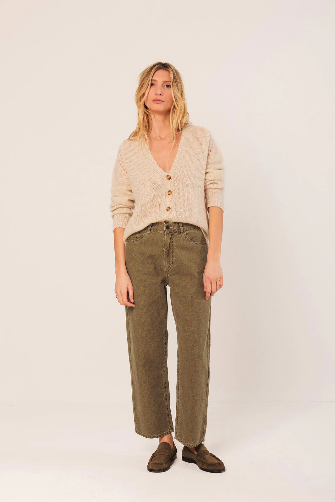 Pantaloni Indi and Cold in denim verde oliva. Taglio morbido un pò baggy, cinque tasche, passanti, chiusura con cerniera e bottone, gamba dritta morbida. Lunghezza alla scarpa.