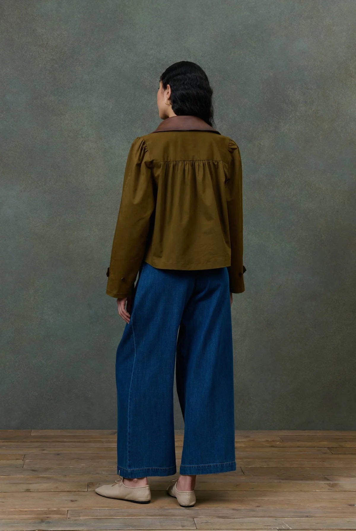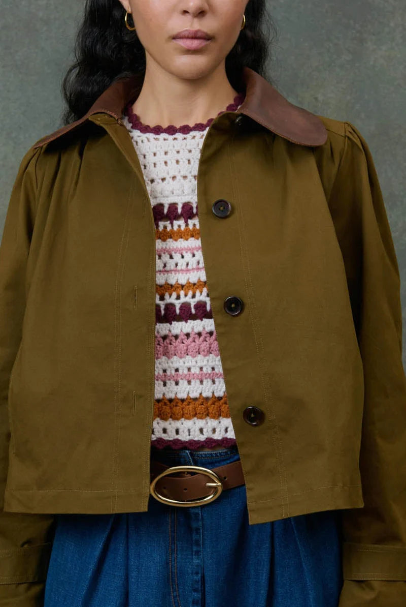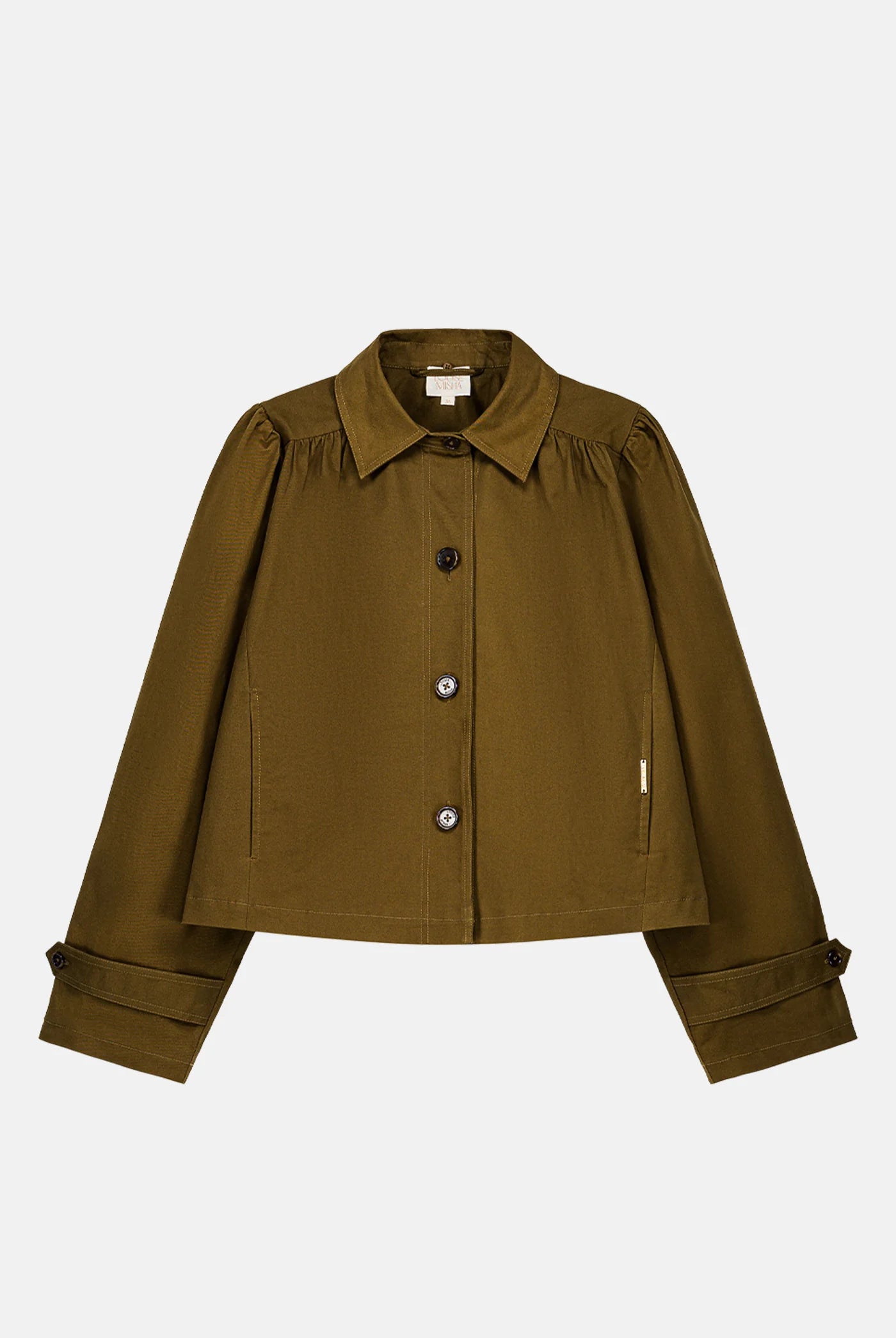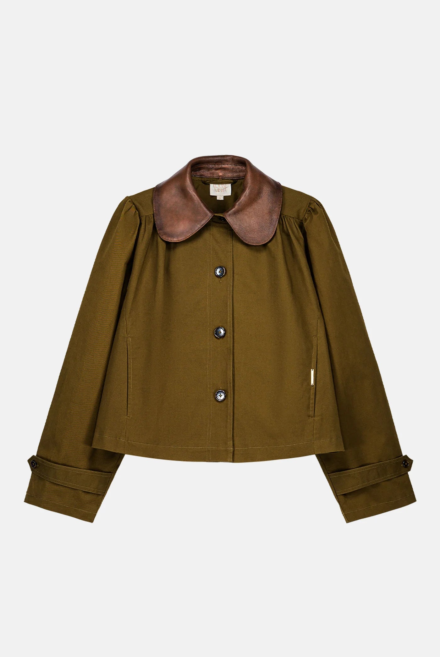 - Giacca Louise Misha verde army con colletto removibile brown in ecopelle. Modello corto svasato con plissè su spalle e schiena. Polsino con laccetto e bottone. Apertura sul davanti con bottoni, tasche laterali verticali. Foderato.